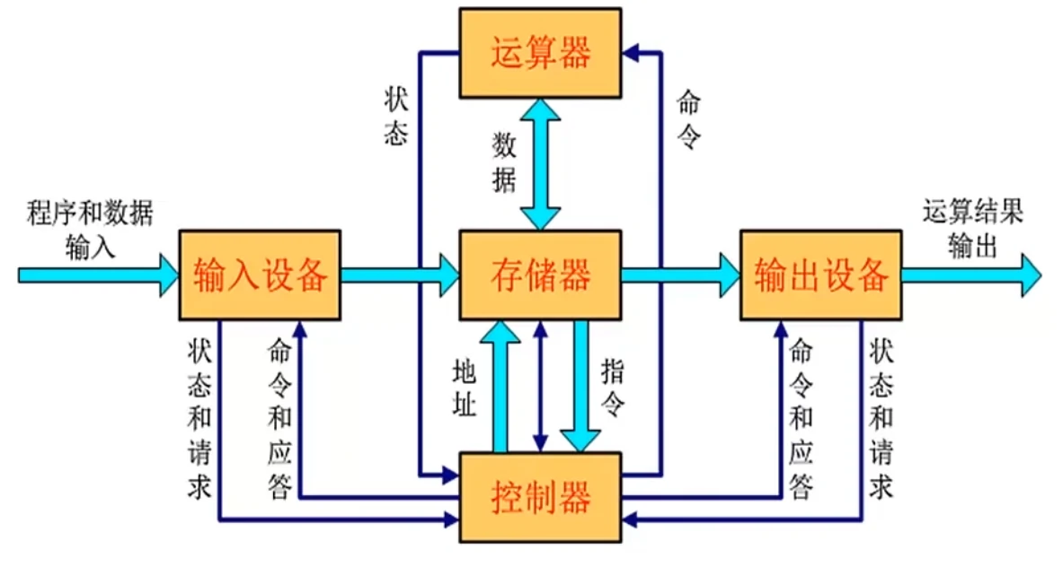 存储器:能存放数据和指令。数据和指令在形式上没有区别(0、1 的序列),但计算机能区分数据和指令