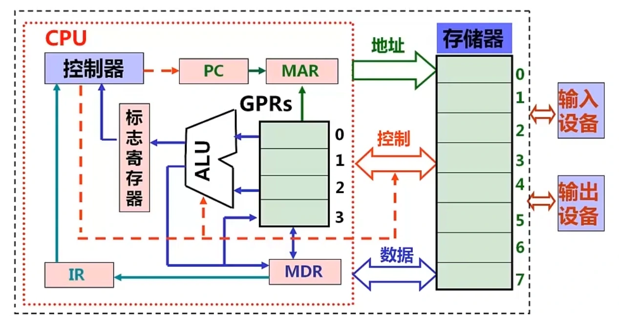 - GPRs:通用寄存器组(由若干寄存器组成,早期是累加器)