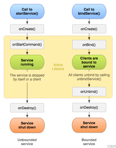 下面是 Service 的生命周期图,其指出了方法的调用时机。其中,onCreate 方法仅调用一次,而 onBind、onStartCommand 方法会依照 Service 的启动方法而调用。